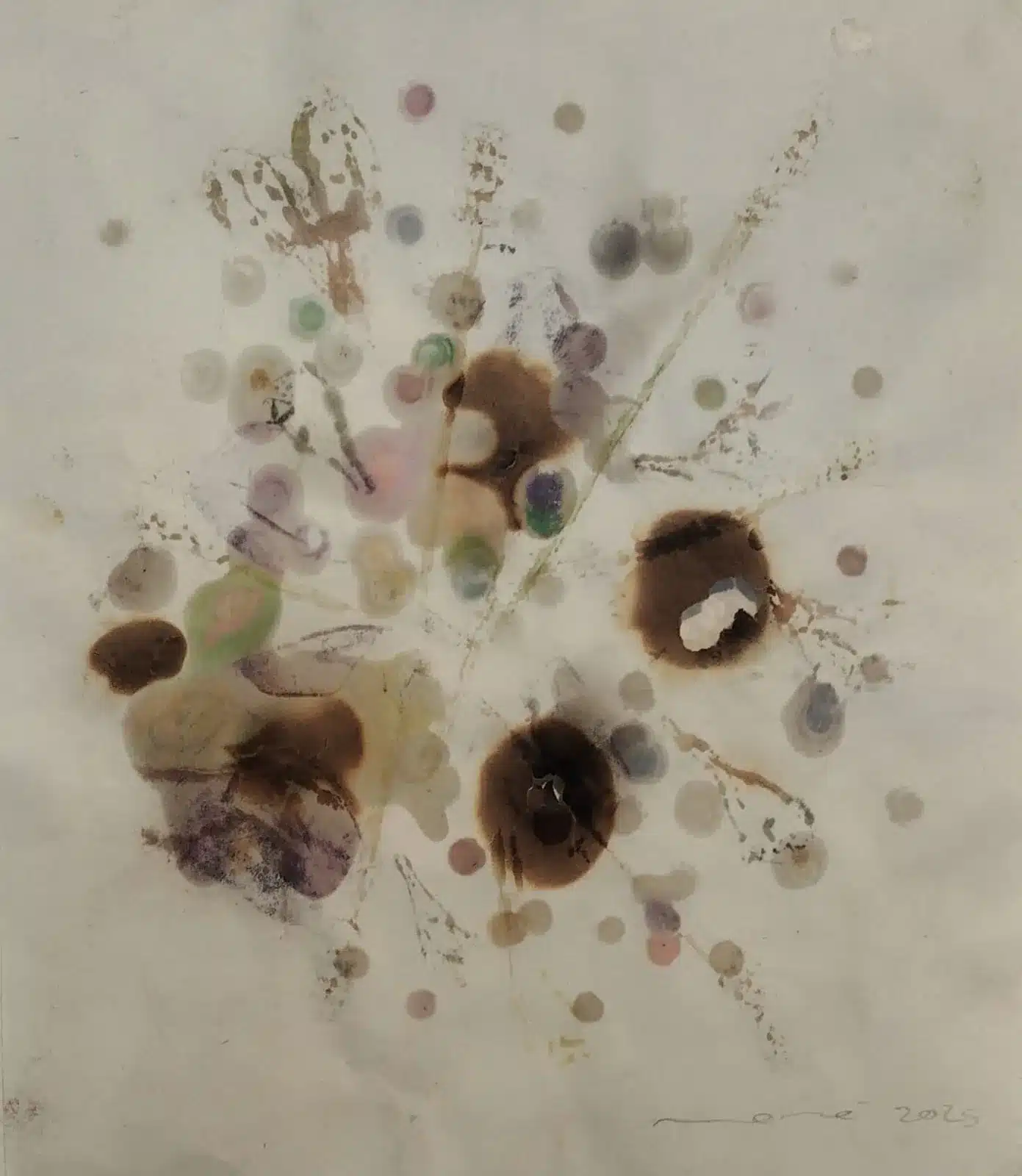 Mixta sobre paper d’arròs (fulls premsats, cera, foc i llapis)