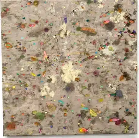 Pintura soterrada a barra d’oli, pastels, acrílic en estampat ecològic sobre cotó